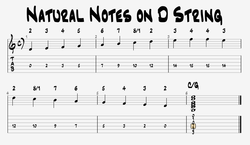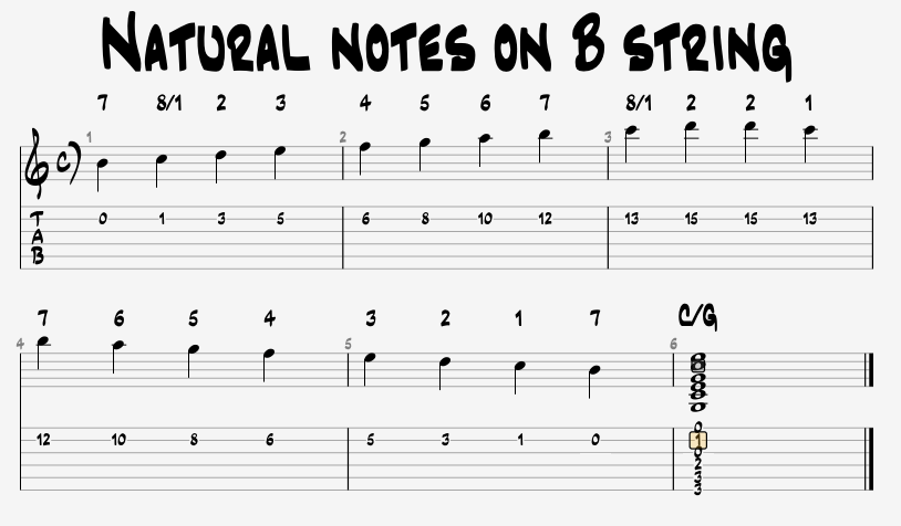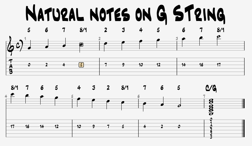 Summarily, B is the open string and that is the 7th of the C Major scale so the very next note is 8/1 and that is why we moved by one Half Step. We see the next Half Step at the 5th and 6th frets, between the notes E and F which also happen to be the 3rd and 4th notes in C respectively. We proceed up the string to the High D and then back down. We will be ending each example with a big C/G chaser just to give harmonic context and resolution to the preceding scale passage.