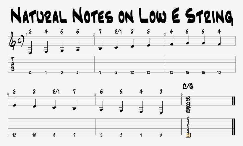 The only times in the above example where we move in a one fret increment are between the 3rd and 4th or the 7th and 8th notes of the scale. We start on E because it’s the lowest note on the string. E is the 3rd note in the C Major scale (C-D-E) and so the next note is the 4th and we see that it is up only one fret, or one Half Step. Following steps 4, 5, and 6, which are unsurprisingly all Whole Steps, we get to the next Half Step which is between B and C or notes 7 and 8 in the scale. Then we move through scale degrees 1, 2 and 3, whereupon we arrive again at a half step between scale degrees 3 and 4 only this time one octave higher than the first two notes on the string and we decide somewhat arbitrarily to top out at the 15th fret with a High G. THen we descend along the string playing all the same notes only in reverse. That’s basically how this will work for all 6 strings.