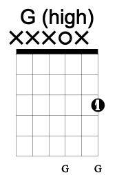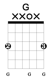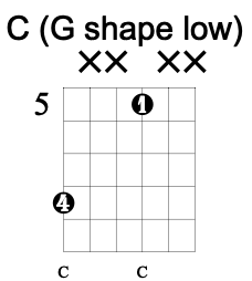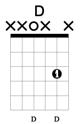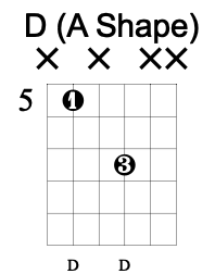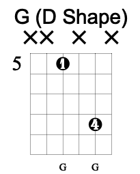 The D chord’s octave shape is found between the open 4th string and the 3rd fret of the 2nd string and as such is identical to the upper octave of the G chord shape.
