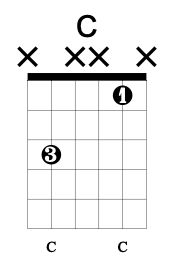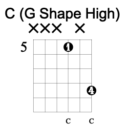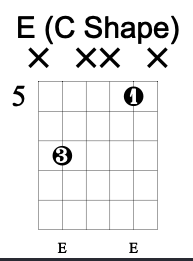 The E chord shape actually has two distinct octave shapes within it: the low one is the box-shape commonly associated with the aforementioned power chords, i.e. “two frets up and two strings higher” while the shape of the E chord’s upper octave is a little more shy about presenting itself. It is the larger upside down L shape that is found between the 2nd fret of the 4th string and the open 1st string. If we move it up one fret we see that it outlines the ‘beginner’ 4-string F chord and, moving onward up the neck, has a shape that can be described as “2 frets down and 3 strings up”. That inverted ‘L’ shape can also be found in the C chord where the octave is found between the 3rd fret of the 5th string and the 1st fret of the 2nd string. It’s the identical “2 frets down and 3 strings up” shape of the upper octave in the E shape.
